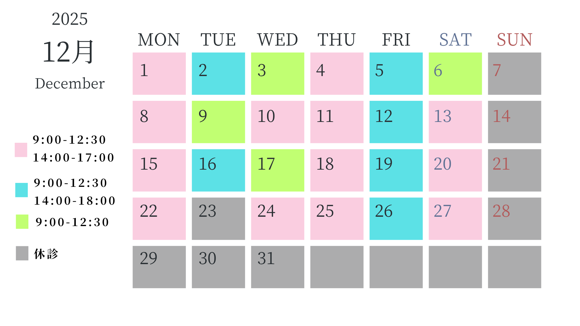 カレンダーからご希望の診察日時をお選びください。予約時間の5~10分前にはご来院をお願いいたします。 -